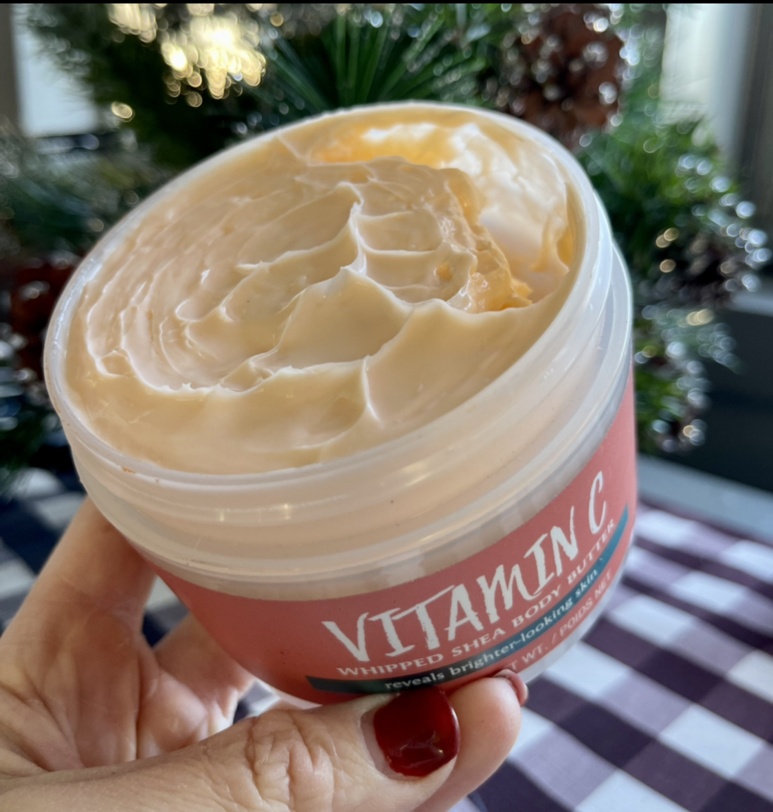 The whipped body butter has Natural Shea Butter for moisture, AHA for fresher looking skin, & Vitamin C for a powerhouse boost for brighter skin.