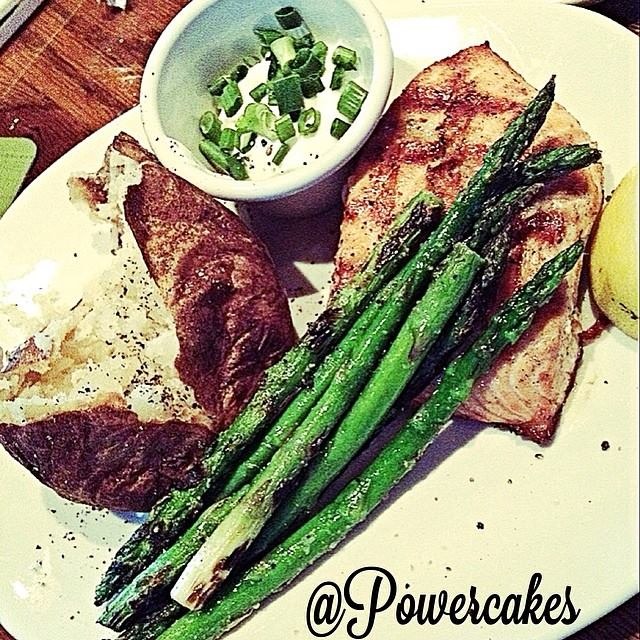 This was delish especially after leg day & training a client! Grilled salmon, baked potato, asparagus, and some sour cream&chives to go on top.
