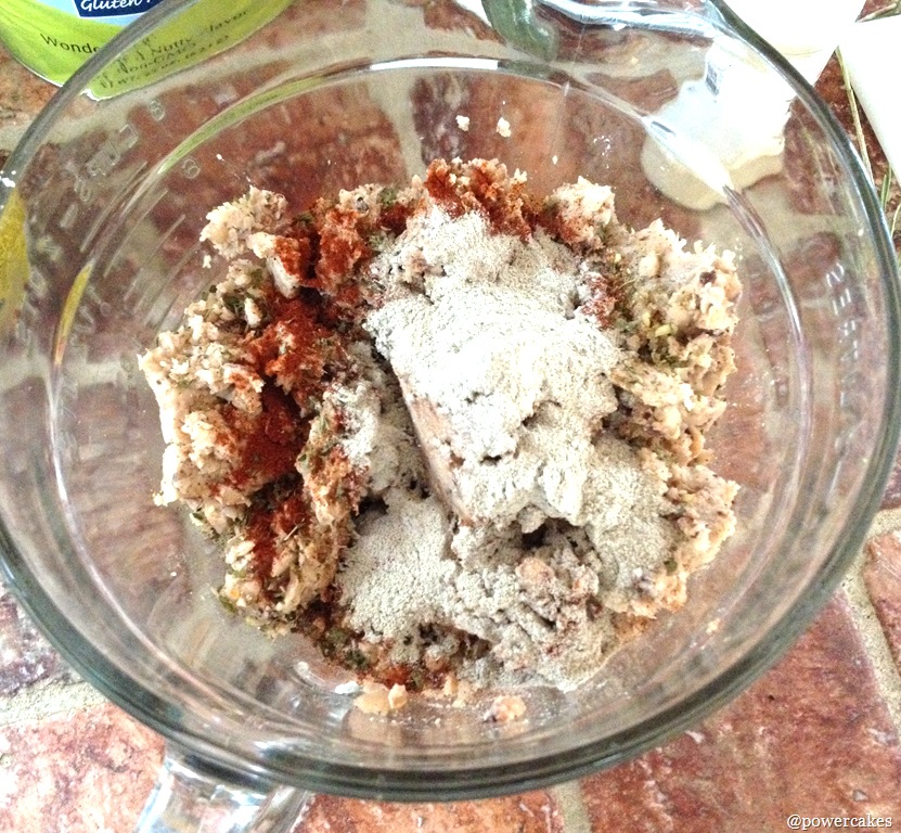 - Pour bean mix into a bowl & add flour, coconut aminos, & seasonings.