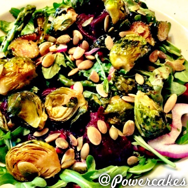 This wasn’t so bad because I enjoyed this genius #powerbowladay combo of arugula, roasted brussels, sea salt roasted beets, red onion, pomegranate seeds, & toasted pepitas! I will be repeating this at home, for sure.
