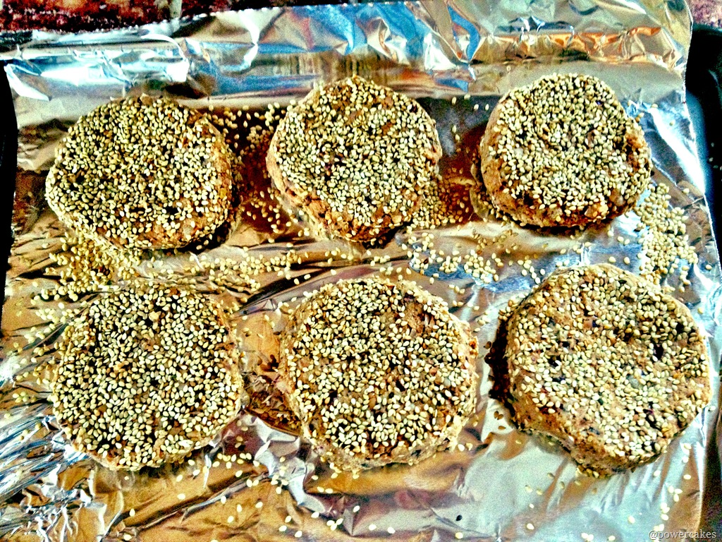 - Form into “cakes” & press each side into the bowl of sesame seeds to coat the outsides.