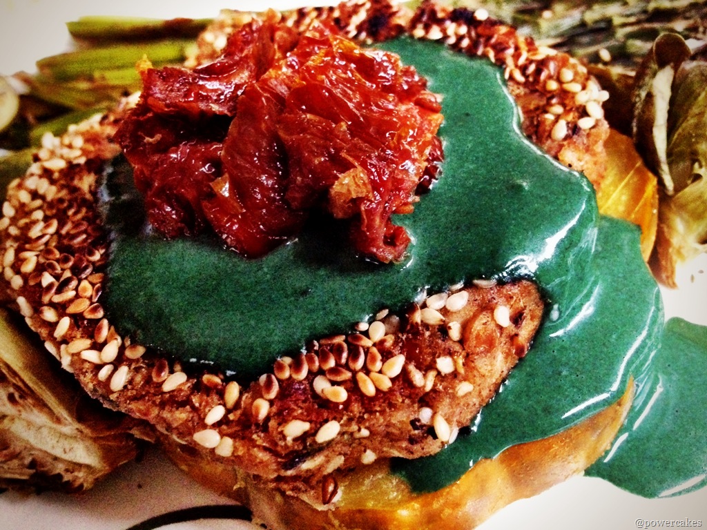 I served my FalafelCakes over Acorn Squash rounds, just cut & roasted at 350 for about 30 minutes, with some sundried tomatoes on top.