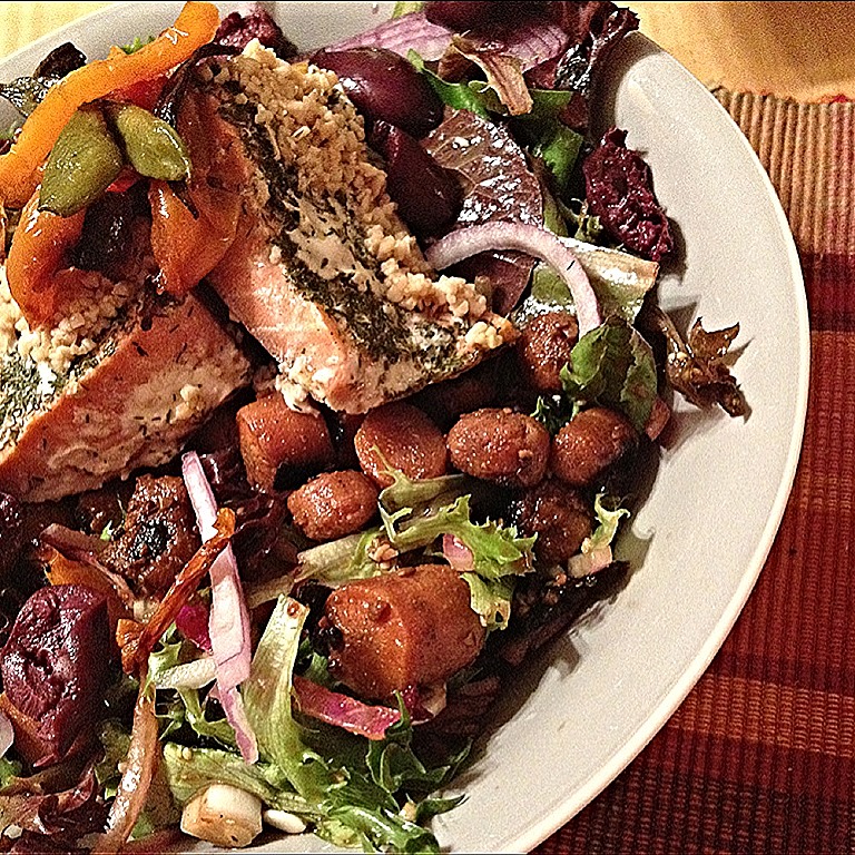 Tossed some greens in balsamic vinegar, dijon mustard, liquid stevia, coconut aminos, & some avocado oil then topped with my new Sweet & Savory Roasted Carrots, onion, peppers, olives, & Garlic Dill Salmon.