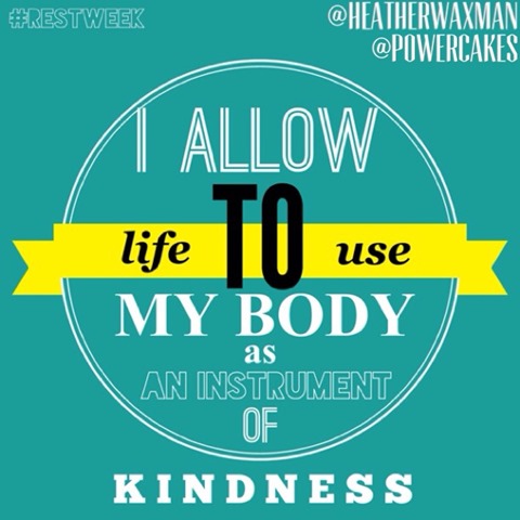 We thought it would be nice to conclude #RESTWEEK with this mantra because it is another great reminder for us of what our body’s true purpose is: to be a vessel of love and KINDness. Go ahead and push play on your #RESTWEEK Playlist. Turn on “Now is the Start” by A Fine Frenzy and DANCE! Repeat the mantra to yourself while you’re dancing. As you know, Heather is a big fan of dance breaks. ;) After dancing, sit your booty down and free write for a few minutes on how you’ve grown this week and what lessons you’ve learned from 7 days of nourishing your bod and mind with rest. If you feel compelled to share your story, shoot us an email. We’d LOVE to read your thoughts! Thank you all for joining us this week. We are so grateful to you!