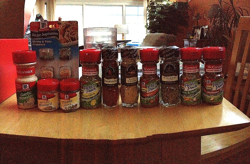 Ahh a foodies spice dream! Garlic powder, dried mustard, thyme, Lemon Herb Perfect Pinch, Smoked Paprika (SO GOOD), cumin, Perfect Pinch Cajun, Dried Rosemary (another favorite), Perfect Pinch Salt Free Garlic & Herb, & Perfect Pinch Salt Free Southwest style!