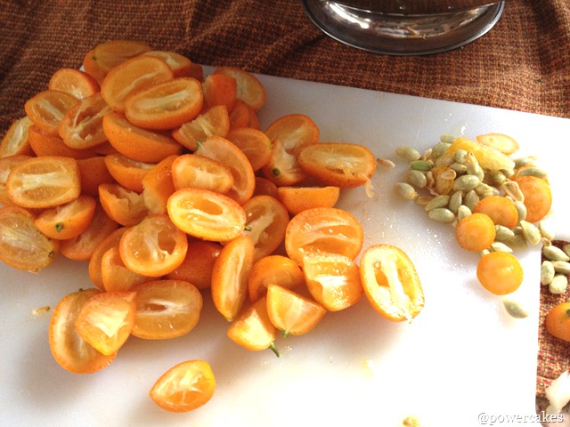 - Chop Kumquats in half & de-seed each one.