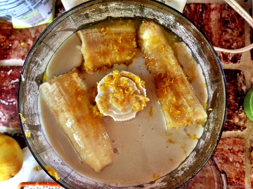2. Add your wet ingredients [banana, milk, vanilla, lemon juice, lemon zest] into the processor & blend until creamy.