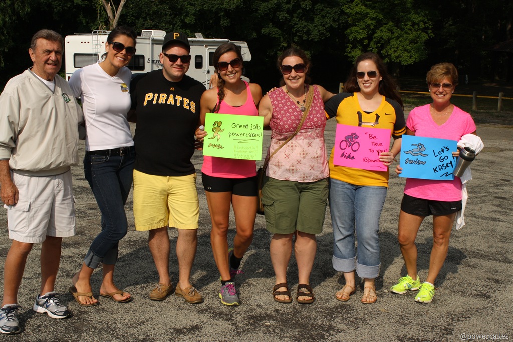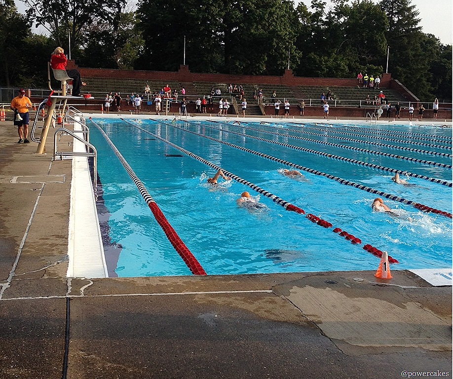 Because I got out of my lane closest to the pool exit, our side had to do a lap around a cone to be even to the other swimmers. Thank goodness my family & friends stood close that I could toss them my swim gear!