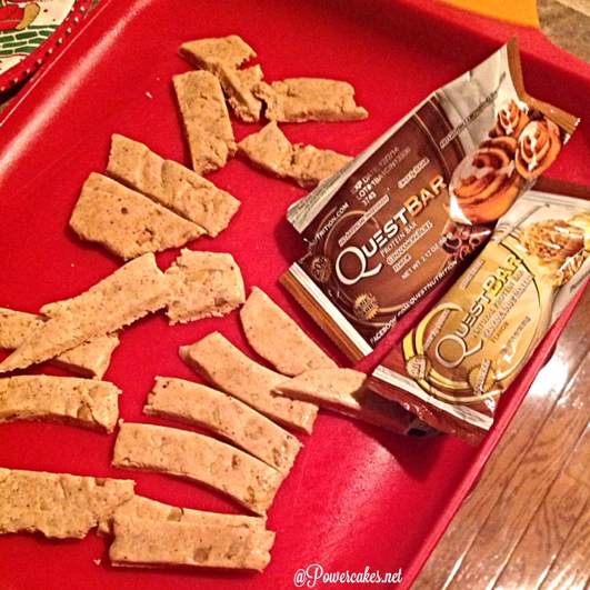 - Choose 3 quest bars & cut each into 6 strips. (you may want to heat up the quest bars in the microwave for like 10 seconds to make them more like “dough” to roll out)