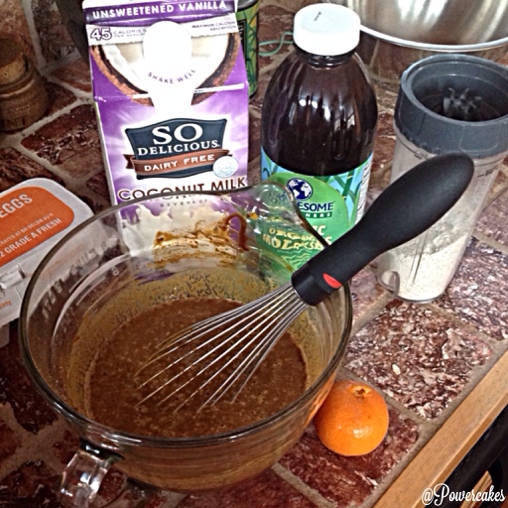 - Combine the wet ingredients [egg, coconut milk, pumpkin, molasses, & clementines (or orange)].