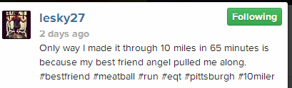 After finding out this news, Sarah turned this tragic event into motivation to make Jessie proud as she ran a 10miler on Sunday in her honor. I was not surprised at all when I received a text from Sarah shortly after the race to let me know that she finished it in 65 minutes!