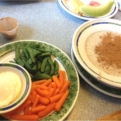 2 poached eggs, veggies, with a side of oatmeal, fruit, & extra cinnamon.