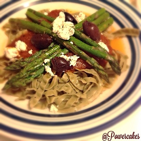 Topped with red sauce, roasted asparagus, olives, & garlic/herb goat cheese! so good! Definitely will be making this combo again.
